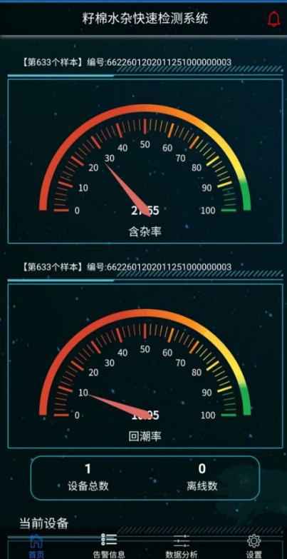 MJAZ-I型籽棉水杂快速检测系统是“国家重点研发计划”、“兵团科技攻关计划”重点支持项目,它采用光电检测、视觉成像、机器学习等技术,能够实现籽棉回潮率与含杂率的快速、准确、自动化检测。目前此系统单个样本检测时间为2-3分钟,检测结果高效准确,其中含杂率检测回归分析决定系数R²为95%,均方根误差RMSE为0.59%,回潮率误差为±0.5。同时,检测结果实时上传籽棉收购系统及物联网服务器,进而在手机app查看实时检测结果。项目申请发明专利1项,授权实用新型专利1项,软件著作权1项,发表SCI论文1篇,研发籽棉水杂快速检测系统1套。