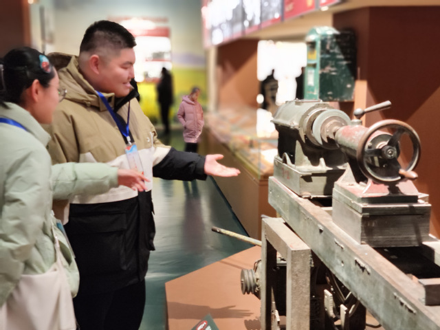 图4 中共党员付宣赫和入党积极分子杨苗驻足在老旧车床前