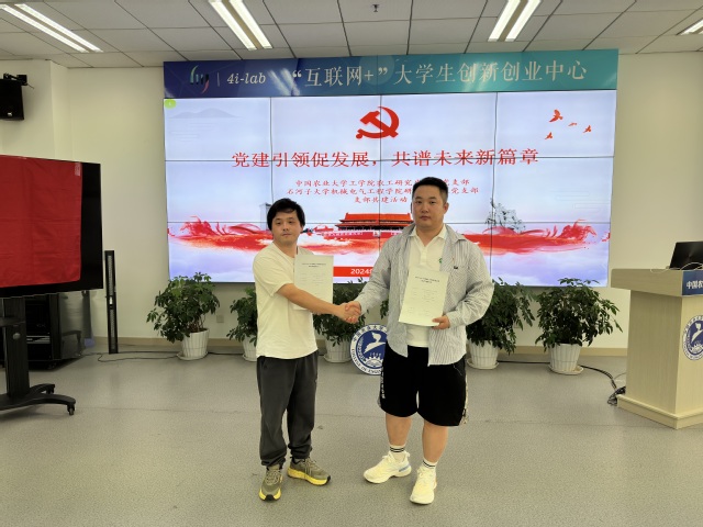 中国农业大学工学院农业工程研究生第四党支部组织委员孙鹏耕、研究生第五党支部书记李英杰分别介绍了双方党支部党建工作开展情况,对组织共建的主要内容和保障措施进行了交流。随后双方在现场签订党建共建协议。